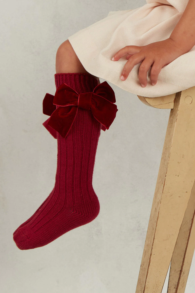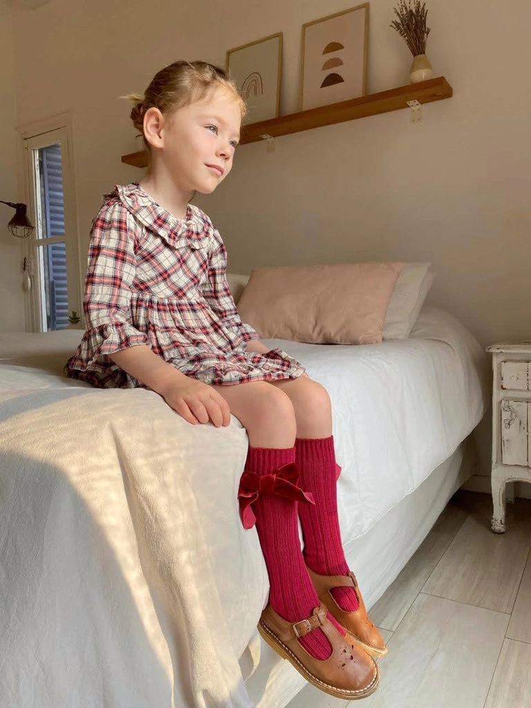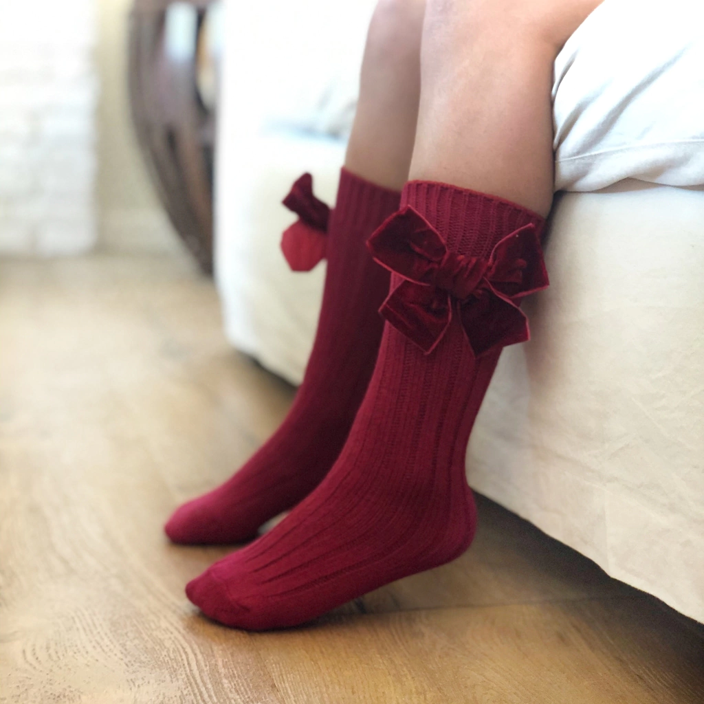 Las medias tres cuartos Bow en pana color bordeaux son puro encanto y calidez. Confeccionadas en una mezcla suave de lana y algodón, abrigan sin perder la delicadeza, mientras su moño de raso al tono añade ese toque especial que enamora.
